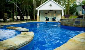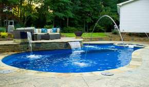 Water cascades through spa spillovers to pool and fun pad, providing a beautiful water feature